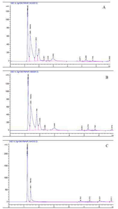 Figure 1. : HPLC chromatograms of fermented samples for 24h. A-B) Nitrate-rich celery-based media C) Nitrate/nitrite sodium standards.