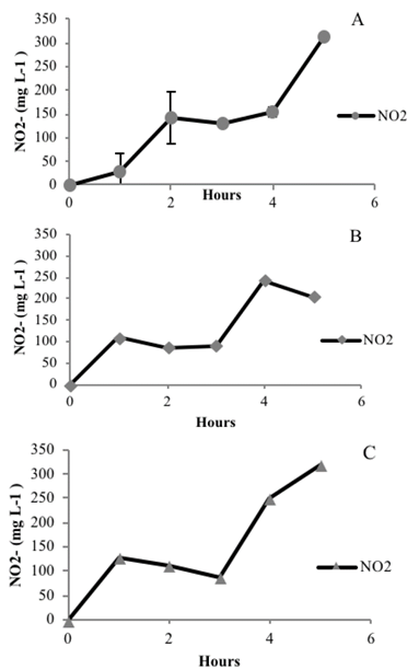 It is possible that the reduced nitrite level in most of the fermentations that took 24 hours was obtained as result of the catabolism of the produced nitrite, once the nutrient and other substrates could be also diminished. Consistent with the above results, short periods of fermentations were performed to catch earlier levels of produced nitrite and avoid the simultaneous degradation of the same secreted nitrite from the media.