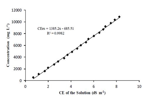 To find the relationship between the electrical conductivity of the solution (ECs) after the salinization and the total of salts to be applied, the desired proportions of salts were dissolved, initially taking as reference the equation proposed by Richards [7], eq. (1).