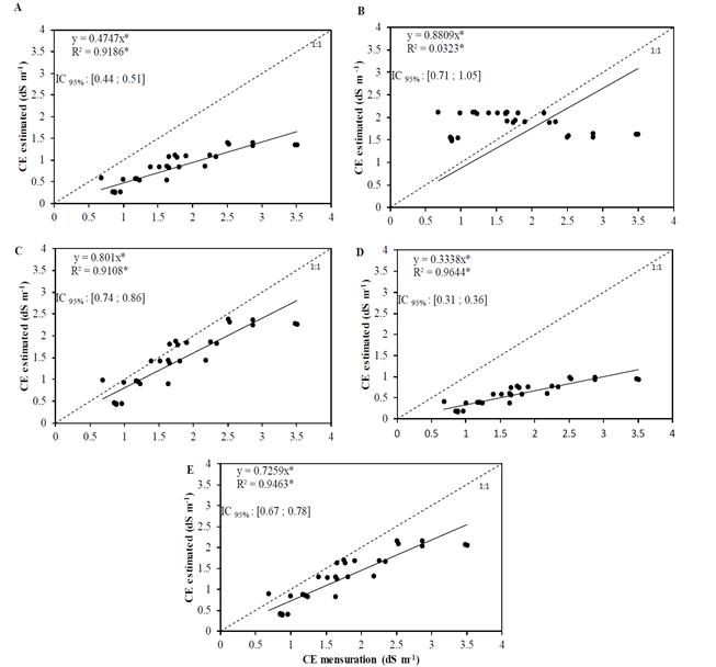 Figure 2. : Relationship between the electrical conductivity values of the saturated soil extract estimated with the equations and values measured from the electrical conductivity of the soil solution obtained with porous capsule extractors for intermittent reclamation (A - Volubuyev; B - Cordeiro; C - Jury; D - Hoffman and E - Reeve)