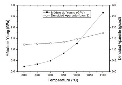 Figura 14. : Efecto de la temperatura en el módulo de Young y densidad aparente del compuesto cerámico.