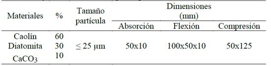 La mezcla utilizada para la elaboración de la barbotina se presenta en la Tabla 1, allí se observan los materiales utilizados expresados en porcentaje en peso, así como las dimensiones de los prototipos las cuales variaron de acuerdo al ensayo al que fueron sometidos (ver Fig. 1).