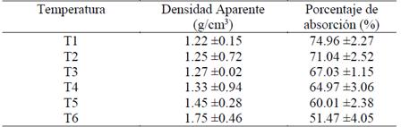 Tabla 2.: Densidad aparente y porcentaje de absorción obtenidos para cada lote de temperaturas.