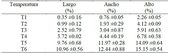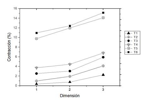 En las seis temperaturas se observa que la dimensión con mayor contracción es la altura, esto ocurre debido a que el peso del espécimen descansa sobre la cara que está directamente en contacto con la pared inferior de la mufla durante el proceso de sinterización, y por tanto, la presión ejercida en esta cara es mayor que en las demás, ocasionando que la altura del cubo cerámico sufra una contracción mayor en comparación con las dimensiones largo y ancho.