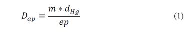 Donde D ap es la densidad aparente de la probeta seca o cocida expresada en g/cm3, m es la masa de la probeta seca o cocida expresada en g, d Hg es la constante que hace referencia a la densidad del mercurio (d Hg = 13.53 g/cm 3 ) y ep es el empuje de la probeta seca o cocida sumergida en el mercurio, expresado en gramos.