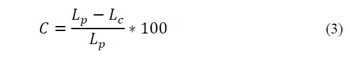 Donde C es el porcentaje de contracción, L p es la longitud del prototipo seco (sin cocción) y L c es la longitud del prototipo sinterizado, ambas longitudes se encuentran expresadas en milímetros.