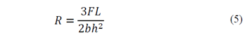 Donde R es la Resistencia a la flexión o Módulo de Rotura expresado en N/m2, F es la fuerza o carga necesaria para causar la rotura de la probeta expresada en Newton, L es la distancia o separación entre los rodillos de apoyo, b es el ancho de la probeta y h es el grosor mínimo de la probeta en la sección de rotura. L, b y h se encuentran expresados en metros.