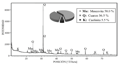 El patrón de la muestra de diatomita se presenta en la Fig. 4, este mineral reveló un alto contenido de moscovita (KAl2(AlSi3O10)(OH)2) y cuarzo entre sus fases mayoritarias con porcentajes en peso de 58.0% y 36.5% cada una. La fase moscovita pertenece al grupo de las micas alumínicas que a su vez se encuentran dentro de la clase de los filosilicatos, se presenta en forma de láminas o capas de contorno hexagonal y otorga a la muestra propiedades dieléctricas y de resistencia al calor [34-36]. Sin embargo, una alta presencia de silicatos de aluminio en forma de moscovita, refleja en la muestra cantidades elevadas de alúmina (AI2O3) y potasio (K), este último bajo la forma de metal alcalino. Por otra parte, los picos característicos de la fase caolinita son bastante débiles en la muestra, con un porcentaje en peso de 5.5% reflejando una mínima presencia de este tipo de impurezas en el mineral.