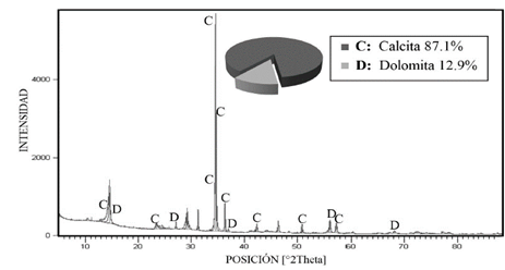 El patrón de difracción de la muestra de carbonato de calcio exhibió picos característicos de las fases calcita (CaCO3) con una participación de 87.1% y dolomita (CaMg(CO3)2) con 12.9 %, como se puede observar en la Fig. 5. La fase dolomita se presenta en la roca caliza debido a una sustitución por intercambio iónico del calcio por magnesio [37,38].