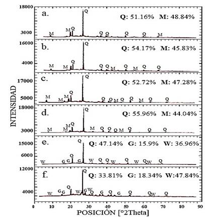 Figura 6. : Patrones de difracción y porcentaje en peso de las fases presentes en los prototipos cerámicos a distintas temperaturas de sinterización. (a). 800 °C (b). 850 °C (c). 900 °C (d). 950 °C (e). 1000 °C (f). 1100 °C.