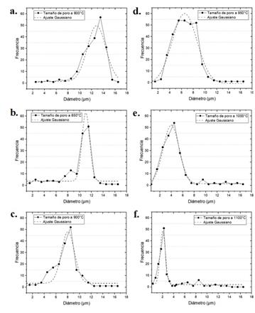 En las distribuciones de tamaños de poros presentadas en la Fig. 8 se corrobora lo observado en la microestructura del material, donde las frecuencias presentan un comportamiento de tipo normal, revelando una amplia gama de tamaños de poros que disminuyen conforme se incrementa la temperatura de sinterización. El ajuste gaussiano permitió identificar que los especímenes sometidos a temperaturas entre 800 y 850 °C presentaron diámetros entre 4.7-16µm (Fig. 6a) y 3.8-12.5µm (Fig. 6b); de 900 a 950 °C se exhibió una microestructura caracterizada por espacios interconectados con diámetros entre 2.7-11.6µm (Fig. 6c) y 1.9-10.4µm (Fig. 6d); por último, temperaturas entre 1000 y 1100 °C revelaron una geometría con cavidades más reducidas que oscilaron entre 0.14-7.6µm (Fig. 6e) y 0.01-3.6µm (Fig. 6f).