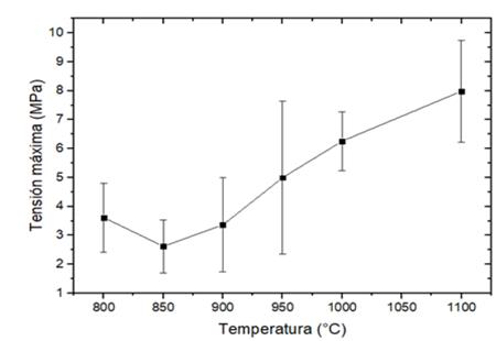 Figura 11. : Media y desviación estándar de la tensión máxima hallada en los especímenes, en función de la temperatura.