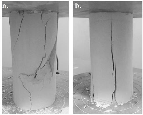 Figura 12. : Orientación de la falla en las probetas cerámicas después del ensayo de resistencia a la compresión. (a). Espécimen 1 a 800 °C. (b). Espécimen 2 a 800 °C.