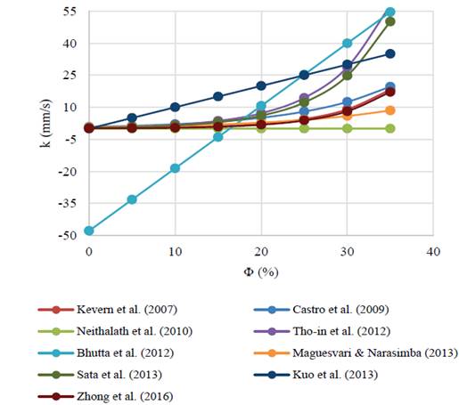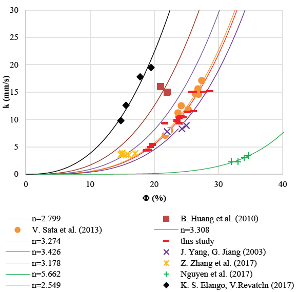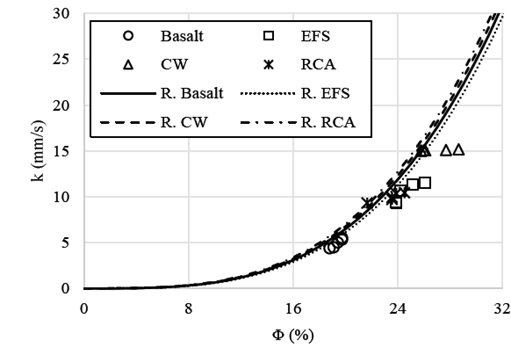 The material work as a homogeneous porous medium and its interconnected voids build a network of internal channels, then the PC meets both conditions, and a correlation between hydraulic properties (permeability and porosity) could exist as shown in Eq. 9.