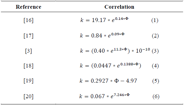 Table 1: References and correlations for permeability and porosity found in literature review.