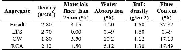 Table 2 presents the density, materials finer than 75 μm, water absorption, bulk density and determination of material finer than 0.075 mm sieve (fines content) for each type of aggregate. These properties were obtained following the requirements of the Brazilian standards NBR NM 53/2003 (ASTM C 127-84) [29], NBR NM 46/2003 (ASTM C 117 - 90) [30], and NBR NM 45/2006 (ASTM C 29 - 90) [31].