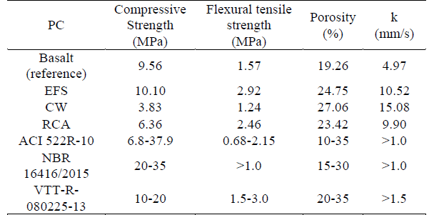The porosities of the PCs with sustainable aggregates were higher when compared with the reference (basalt), since the sustainable aggregates presented lower density, greater water absorption and lower content of fines allowing the formation of high porosities.