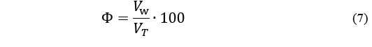 In that sense, porosity (Φ) was obtained using Eq. 7, that considers the volume of water (Vw) and the total volume of the sample (VT). Notice that five samples for each mixture were tested to obtain this property.