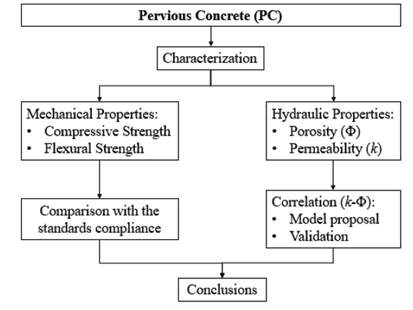 As shown in Fig. 2, phase 1 regards the mechanical characterization of the PC mixes and the evaluation of the experimental results; in phase 2 the hydraulic properties of the mixtures are studied; phase 3 compares the experimental data with the requirements established in international standards, and finally, in phase 4 a proposal equation to correlate the hydraulic parameters (porosity and permeability) is presented.