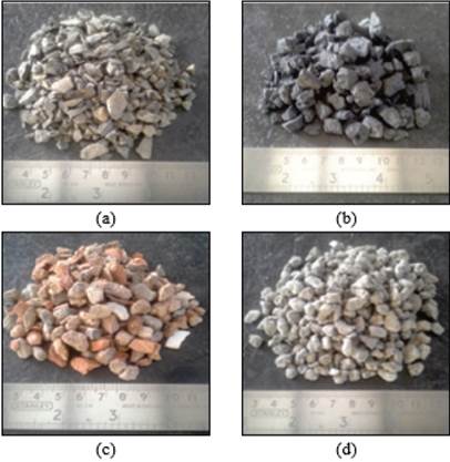 Figure 3: Aggregates: a) Basalt b) EFS c) CW and d) RCA.