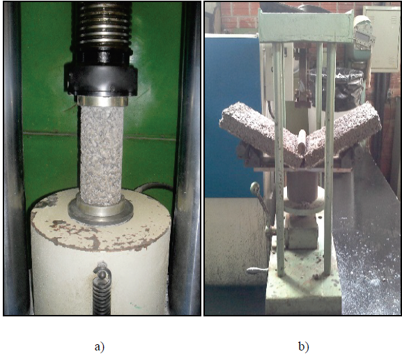 Figure 5: Mechanical tests performed: a) compressive strength and b) flexural strength.