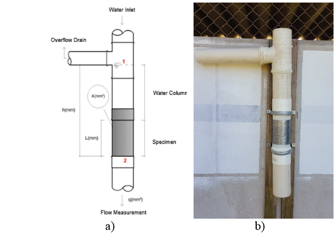 Figure 6: . Constant head permeability test: a) schematic view and b) final set up.