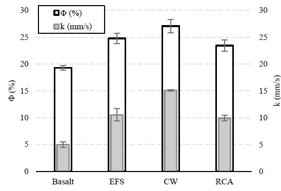 Fig. 8 presents the results of the hydraulic properties: porosity (Φ) and permeability (k). The results presented consider the type of aggregate used in the mixtures production and the results deviation.
