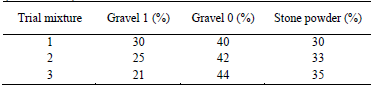 Table 3: Percentage composition in mass of the experimental aggregate mixtures (trial mixtures) considered in the research.
