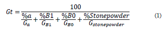 where %a, %B1, %B0 and %stone powder are the masses percentages and Ga, GB1, GB0 and Gstonepowder are the apparent specific gravity of the asphalt mixture constituents.