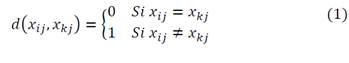 Distance between individuals: These are calculated based on the number of dissimilarities in the responses given by the individuals for every item j [25]. Given set 𝐵={1,2,3,4,5} and assuming that the responses between two individuals (i and k) are observed to the j-th item, that is, 𝑥𝑖j,𝑥kj. ∈𝐵. The dissimilarity function 𝑑(⋅,⋅) for the j-th item, of 𝐵×𝐵→ℝ, is defined as: