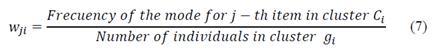 The mode is calculated component by component. When working component by component, several modes can be obtained, i.e., several points with the same frequency. The lexicographic order will determine the mode to be considered. For the case in which each cluster has only one individual, the mode for each attribute corresponds to the value of the item.