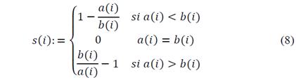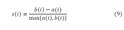 From equation (8), it can be observed that the values of s(i) go from −1≤𝑠(𝑖)≤1. Hypothesizing extreme situations, we find that 𝑠(𝑖)≈1 implying small values for 𝑎(𝑖) with respect to 𝑏(𝑖);;therefore, we can conclude that observation i is well located. It is in the appropriate cluster. The contrary situation, in which 𝑠(𝑖)≈−1,, indicates that the observation has been assigned to a group where it does not belong. Values close to zero indicate that the observation is located between two clusters.