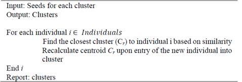 For each individual, the inverse of the distance to each of the previous centroids is calculated. Subsequently, all of these inverses are added and finally, they are ordered in an increasing order based on the value of the sum. The individual with the smallest value is chosen as the next centroid.Fig. 3 presents the pseudo-code for selecting the seeds.