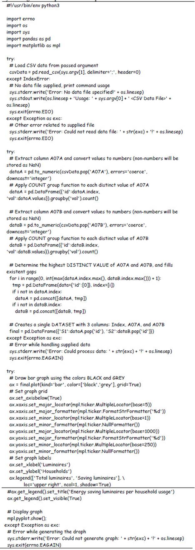 With the same data, a comparison was made between the total number of luminaires and those households equipped with energy-saving luminaires per house for the latest available year, that is, 2016. To achieve this goal, the Python programming language was used, and its code is displayed in Table 2. In a quick overview, the code allows the data to be loaded from a CSV data file and presents the information of interest in a graphical manner, in this case the number of in-home luminaires.