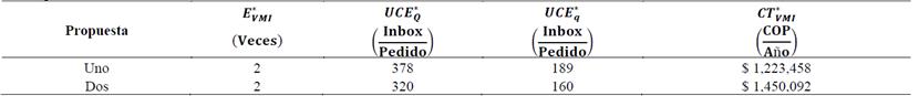 Además, es importante aclarar que la segunda propuestas se origina, de valorar los costos de conservación del inventario, en términos, de la tasa de conversión de la EEEC (F = 48% anual), lo que equivale a: i) H = $ 2,535