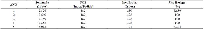 Otros rasgos necesarios, para modelar la estrategia de negocio Gana-Gana de la EEEC, se cita a continuación: i) la capacidad máxima de bodegaje que el CEDIS, asigna a esta línea de negocio es de 560 Inbox; ii) la política de bodegaje es caótica; y iii) el sobrecosto máximo admisible para la gestión del inventario conjunto es del 10% anual. En vista de lo expuesto, se hace la simulación que muestra en la Tabla 7.