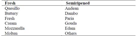 In Peru, there exist regions that produce different varieties of cheese, nevertheless, the best known are: fresh cheese, paria, andean, dambo, gouda and others, as shows in Table 2.