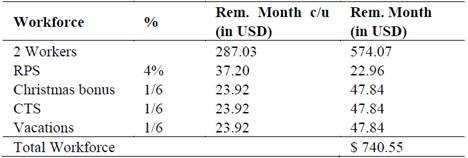 According to Table 4, the total cost of labor is obtained from the remuneration of the personnel plus the labor benefits.