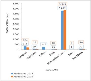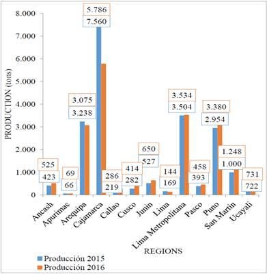 Fig. 4, cheese production by region, shows that the cheese production for the year 2015 is 21,395 tons and for the year 2016, it registers a decrease to 20,777 tons; likewise in both years it is appreciated that Cajamarca, Lima, Arequipa and Puno stand out.
