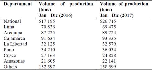 The Table 1 shows the volume of milk production per region in the years 2016 and 2017 with Lima, Arequipa, Cajamarca, La Libertad and Puno standing out. On the other hand, the big milk industry is located in three main basins, which have lately been extended in La Libertad and Lambayeque and it is formed mainly by three big companies: Gloria, Nestlé and Laive [21].