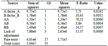 Table 1.: Analysis of variance for the surface response (central compound design with star points).
