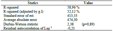 For other fitness and assumption statistics, the R2 statistic indicates that the adjusted model explains 58.96 % of the variability in volume. The adjusted R2 statistic, which is more suitable for comparing models with different numbers of independent variables was 52.12%. As regards serial self-relation, no statistical evidence of non-compliance with no autocorrelation in waste was presented (p=0.89) (Table 2).