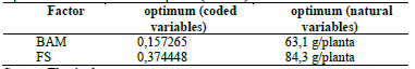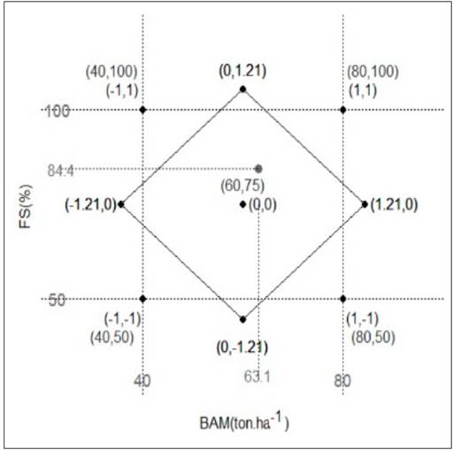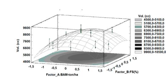 Table 3 shows the optimal (maximum) for the BAM and FS factors together with the points of the coded variables together with the levels in coded variables where the factors oscillated. The optimal volume was 8566.9 cm3 when using BAM at a level of 63.1 ton- ha-1 and FS at 84.3 g per plant.