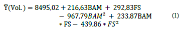 The following eq. (1) is the equation of the adjusted second degree model, where the values of the variables are specified in their original units, where Y ̂ represents the estimated volume, BAM represents the biochar dose and FS the synthetic fertilizer dose.