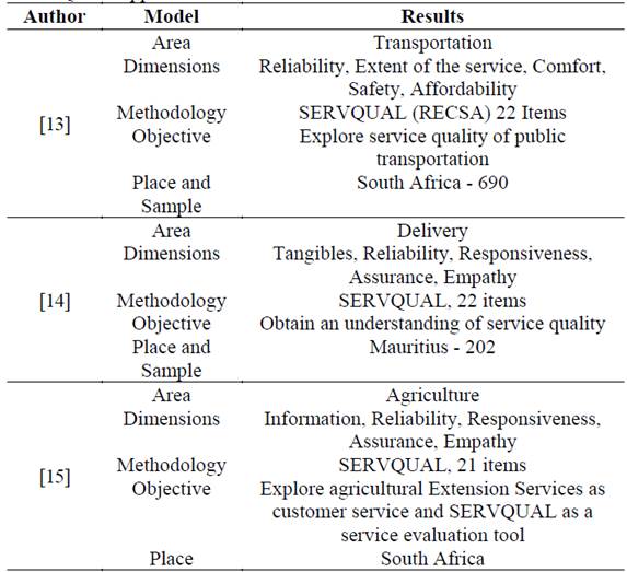 Service quality is a very important topic for researchers around the world, and many studies have been carried out to deepen the knowledge about the subject in service fields as Education, Health, Transportation, Banking, and others. The following examples describe the work of some authors in different countries, divided by continents: