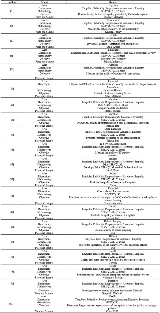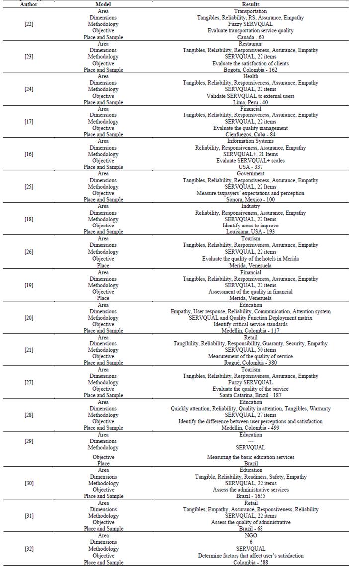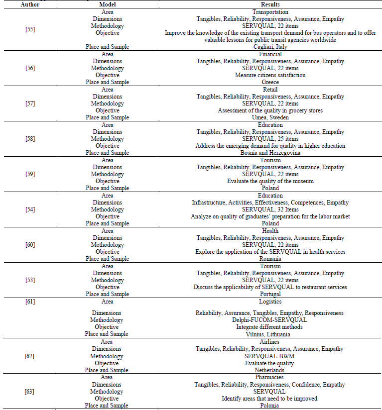 As shown in Table 2, a summary of studies performed in America using the SERVQUAL methodology. Further analysis was given to the dimensions explored, as well as the methodology, main objective, location, and sample.