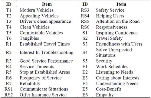 According to the needs of the study, the expectation-perception SERVQUAL model was adapted, which consists of 5 variables: Tangibility, Reliability, Responsiveness, Security and Empathy, and 25 items. The subjects of the study were users over 15 years old who regularly use the system. Users answered the expectations questionnaire the before getting on the transport vehicle and for the perceptions questionnaire, users answered it after getting off the vehicles. For each questionnaire, the sample was 392, a total of 784 people participated in the study, and their answers where measured using a five-point Likert-type scale.