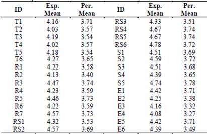 The mean comparison shows that respondents have a high expectation level, with 4 points or above, whereas their perception level is 3, with gaps between 0.5 and 1 points.