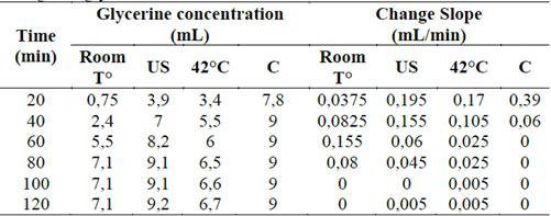 The temperature also influences the rate of change of the glycerin concentration, since the curve of 42 °C has a maximum slope of 0.7 mL / min, the process with ultrasound, and the combined, have a value of 0.5 mL / min, and the ambient temperature curve of 0.22 mL / min. However, it does not have the same effect on the production efficiency of glycerin compared to the reference value (9.5 mL); because the ambient temperature curve reaches a final glycerin volume of 7.1 mL (75% efficiency), and the curve of 42 °C a value of 6.7 mL (71% efficiency). The effect with the greatest impact on the reaction efficiency is ultrasound with a final value of 9.2 mL (97% efficiency); even above combining the ultrasound and a temperature of 42 °C, in which it ends with a volume of glycerin of 9 mL (95% efficiency).