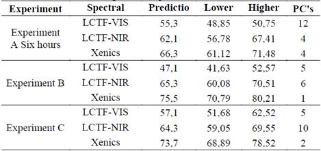 In experiment B, a predictive power of 77.5% was obtained with a confidence interval of 70.8% and 80.2%. For experiment C, predictive power was of 73.7% with a confidence interval of 68.9% and 78.5%. In all three experiments, the NIR spectrum was higher in the prediction than in the VIS-NIR spectra.